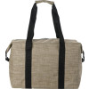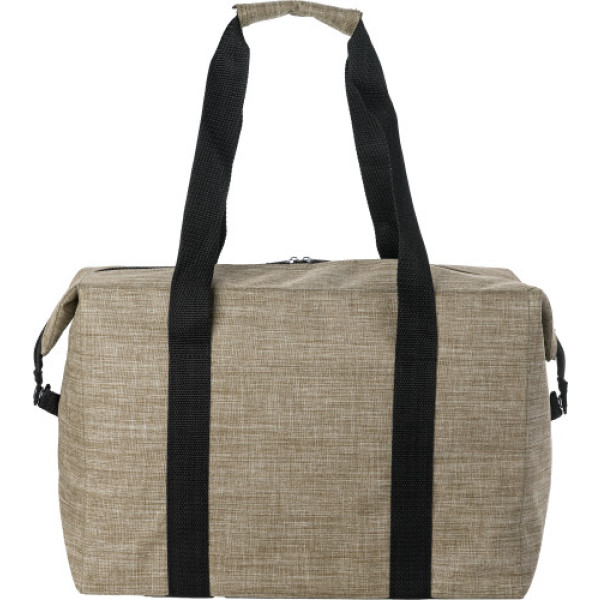 600D polyester cooler bag. One large compartment and one small pocket on the front side. Two short carrying straps with Velcro closing. Inside is foam insulated with aluminum.