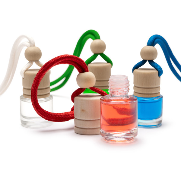 Air freshener with different scents in a glass recipient with wooden cap and matching adjustable cord. 5 ml capacity.