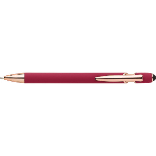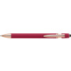 Aluminium ballpen with rose gold details and rubber tip for capacitive screens. Blue ink.