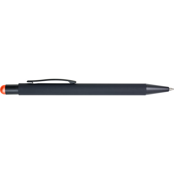 Aluminium and ABS ballpen with rubber coating and rubber tip for capacitive screens. When the pen is lasered, the imprint will show in colour. Blue ink.