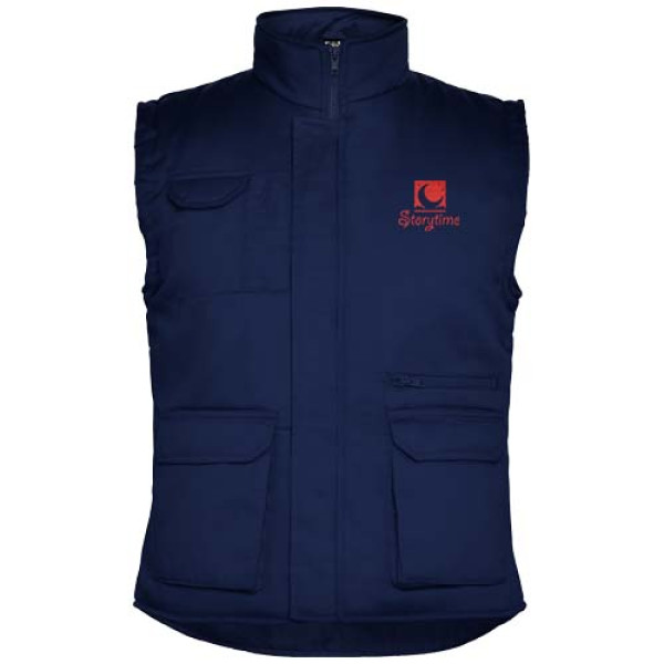 Multipurpose workwear bodywarmer with high neck. Front zipper with strap and hook & loop fastening. One outer phone pocket on the right side. Two front gusseted pockets with side vents. Two small pen pockets. One inner pocket with hook & loop fastening. Zipper pocket. Drop tail. Adjuster with self-fastener.