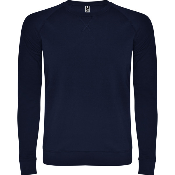 Unisex round neck sweatshirt in non-brushed cotton. Raglan sleeve. 2x1 ribbed collar, cuffs and waistband with elastane. Decorative flatlock cross-stitching. Taped seams in matching fabric.