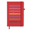 A5 notebook with recycled PU cover. Casebound. 192 recycled paper lined pages (96 sheets). Matching elastic closure strap and ribbon page-marker and pen holder.