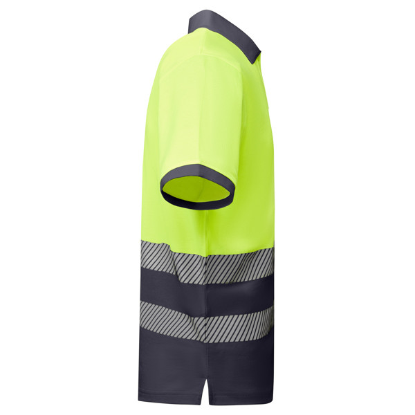 Technical high-visibility short-sleeve polo shirt.· 1x1 ribbed collar.· Contrasting 3-button placket.· Two segmented high-visibility strips on chest.· Comfortable mixed fabric in polyester and cotton for greater breathability.· Optional pocket.