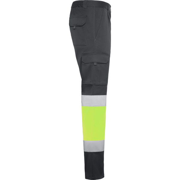 High-visibility multipocket trousers.· Comfortable and adjustable fabric.· Back elastic waistband.· Two front pockets.· Two back pockets with flap and velcro fastening.· Two pleated side pockets with flap and velcro fastening.· Two-colour combination with horizontal high- visibility strips.
