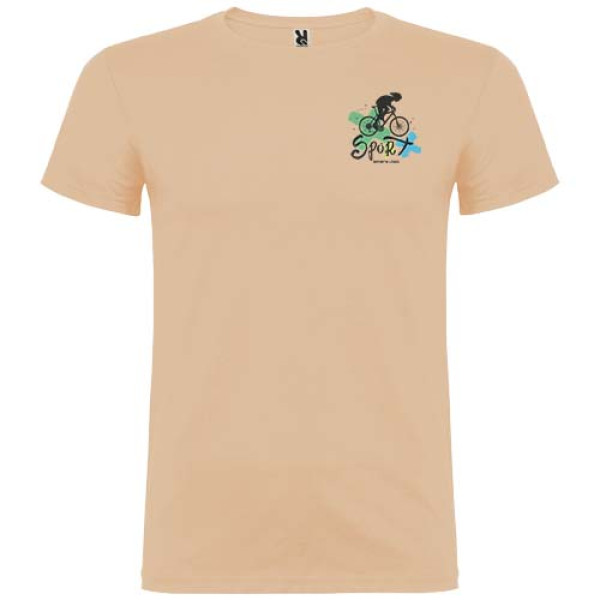 Short-sleeve t-shirt with double layer crew neck in elastane, made in tubular fabric for adults. Reinforced covered seams in collar. Removable label. The model is 190 cm and is wearing size L.