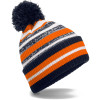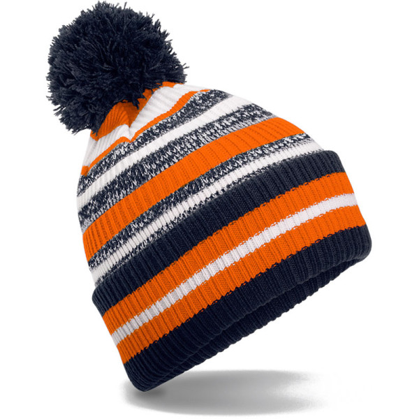 Self-coloured pompom, wide brim, striped design, double knitted, soft and warm, TearAway label, hand wash, not suitable for tumble drying, do not dry clean. 100% recycled polyester, microfleece lining
