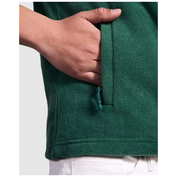 Fleece vest with polo neck and matching zipper. Side pockets with matching zipper. Removable label. The model is 185 cm and is wearing size M.