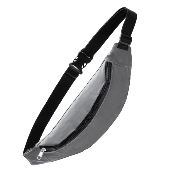 Reflective waist bag with large front pocket made of polyester.