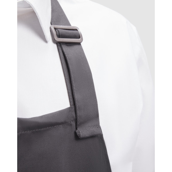 Long apron in twill fabric.· Neck strap with adjusting plastic buckle.· Side tie-straps.· Two front pockets.· Pocket measures: 40 x 22 cm.