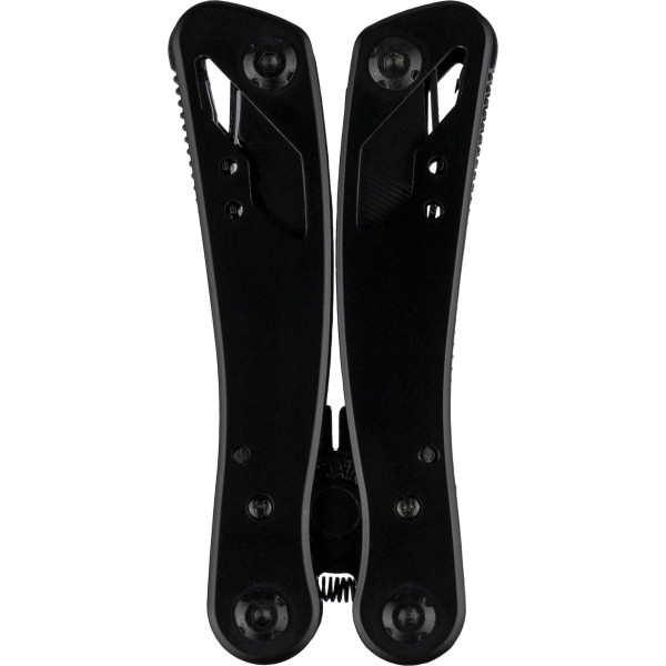 Black aluminium and stainless steel multitool with 13 functions including knives, screwdrivers, pliers, saw, file, lever, bits, spring, loop bar, can opener, and tang. Comes with a pouch featuring a velcro belt loop and additional outer box. Individually packaged in a brown cardboard box.