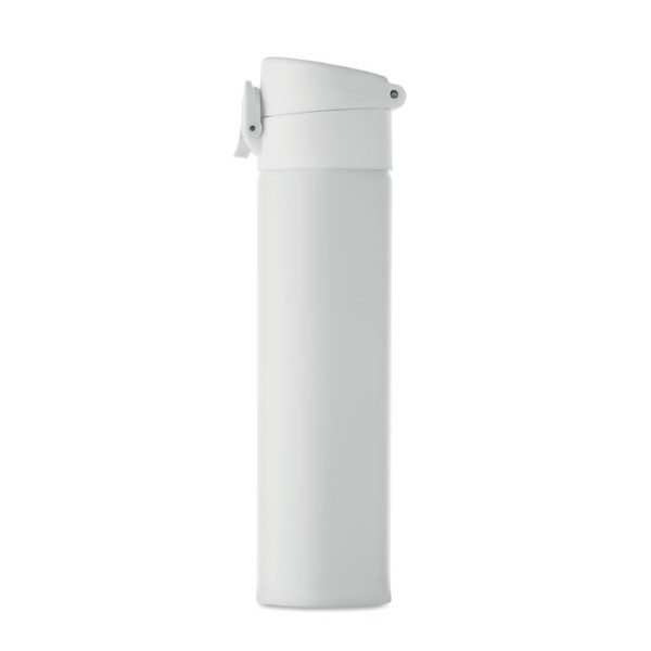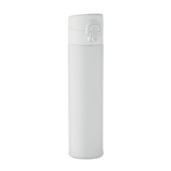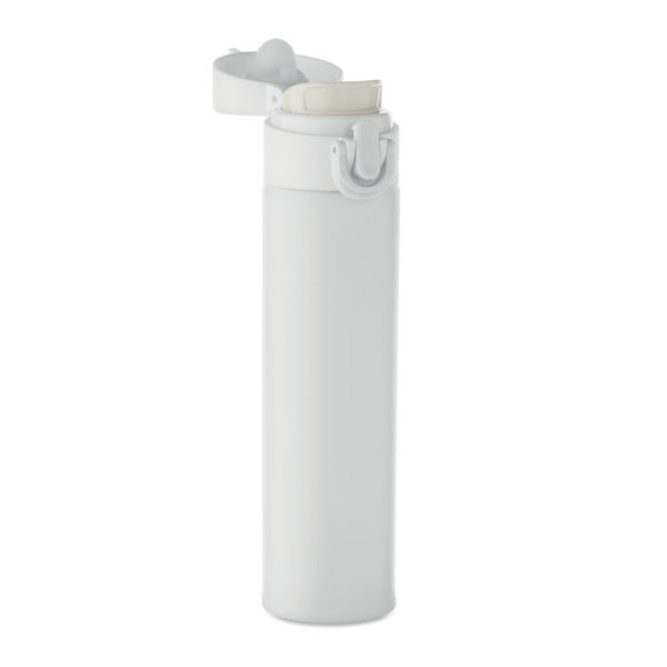 Double wall drinking bottle in recycled stainless steel (90% recycled stainless steel and 10% stainless steel) with security lock on the lid and press-to-open option. Leak free. Capacity: 300ml.