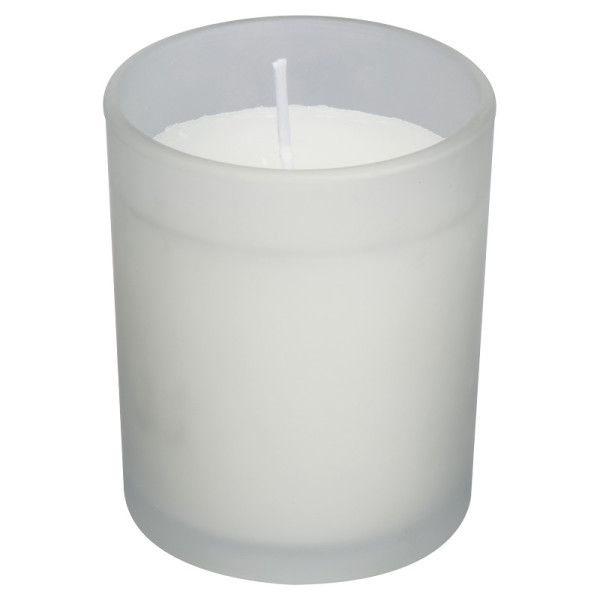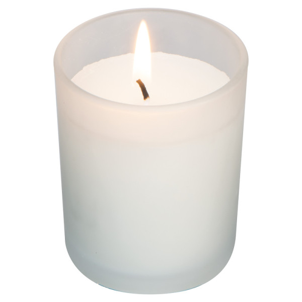 Candle in an elegant frosted glass with bamboo lid, decorative and versatile. Your logo will be engraved on the lid.