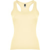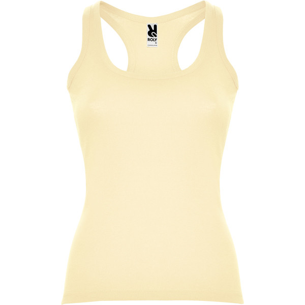 Fitted style tank top with wide and round ribbed neckline and armholes. Racerback and side seams.