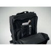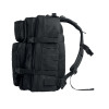 Outdoor 50L backpack in 600D RPET with padded laptop compartment and several inner compartments, zip front pockets, mesh padded straps and back, hip belt, and elastic supports for accessories.