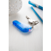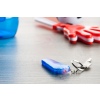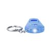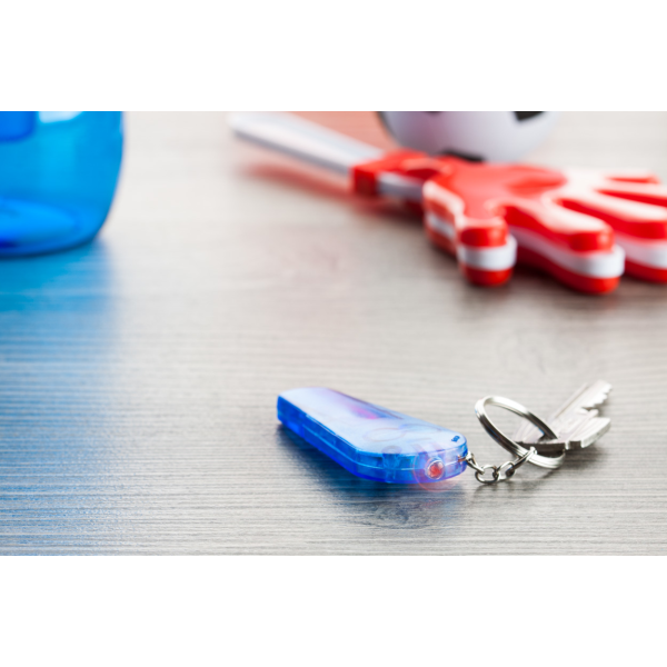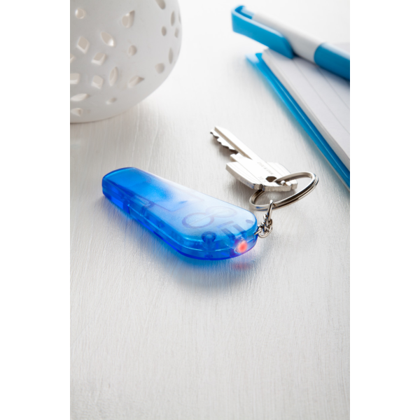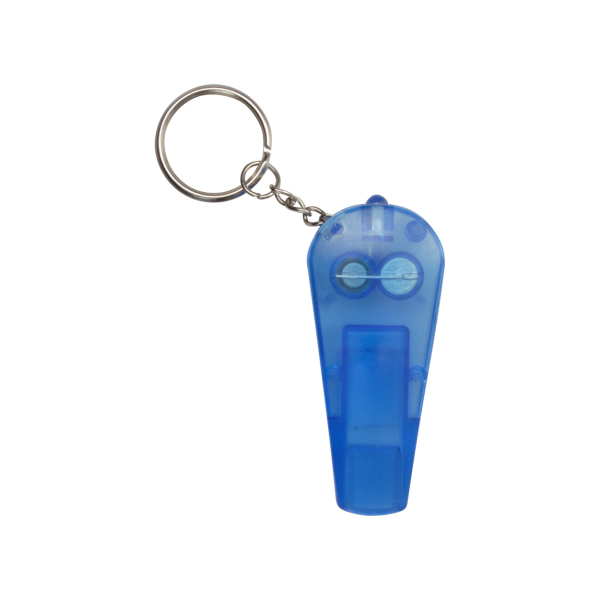 Transparent coloured plastic whistle with keyring and mini flashlight. With button cell battery.