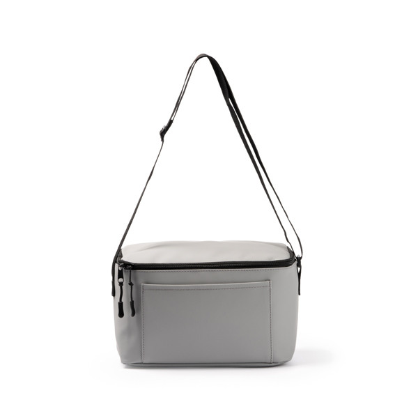 Cooler made of PU leather with adjustable handles. Inner isothermal compartment. Practical outer front pocket.