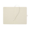 A5 notebook with hard RPET polyester corduroy cover and 192 lined recycled paper pages (70 gr/m2). Casebound design with elastic band closure, pen loop, ribbon page marker, and washed kraft paper tag.
