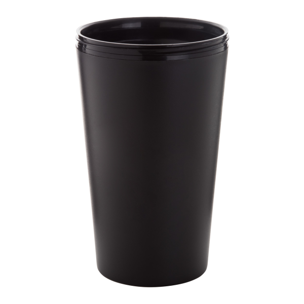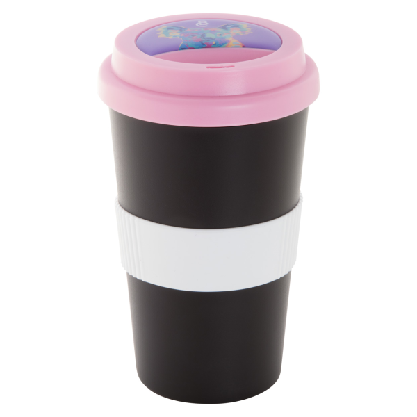 Customisable, double-wall plastic thermo mug with drinking lid and silicone grip. 400 ml. MOQ: 50 pcs.