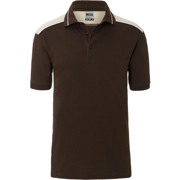 Knitted polo shirt collar and cuffs, 3- button-placket, necktape, contrasting stripes on collar, inserts in contrasting color on side and shoulder, piping on the front shoulder, 60° washable, suitable for tumble drying at low temperature. 200g/m², 50% cotton, 50% polyester