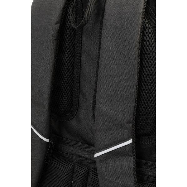 RPET backpack with zipped compartments, 2 zipped front pockets, zipped side pockets and padded laptop (15") compartment. With padded back and shoulder straps, anti-theft pocket and trolley strap. With 300D RPET polyester, with distinctive RPET label.