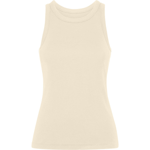 Women's ribbed knit tank top. Wide raw collar and armholes in the same fabric and reinforced with two seams. Double stitched hem.