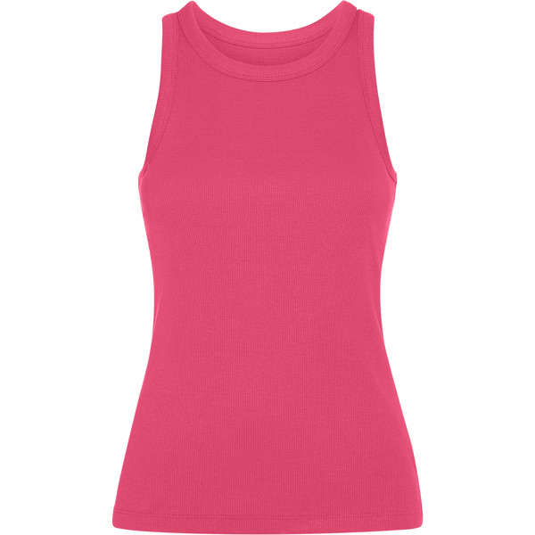 Women's ribbed knit tank top. Wide raw collar and armholes in the same fabric and reinforced with two seams. Double stitched hem.