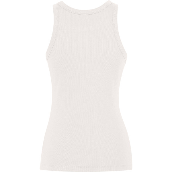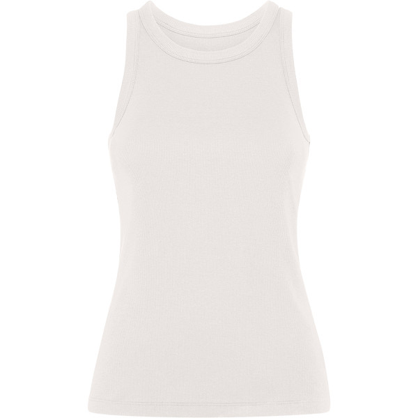 Women's ribbed knit tank top. Wide raw collar and armholes in the same fabric and reinforced with two seams. Double stitched hem.