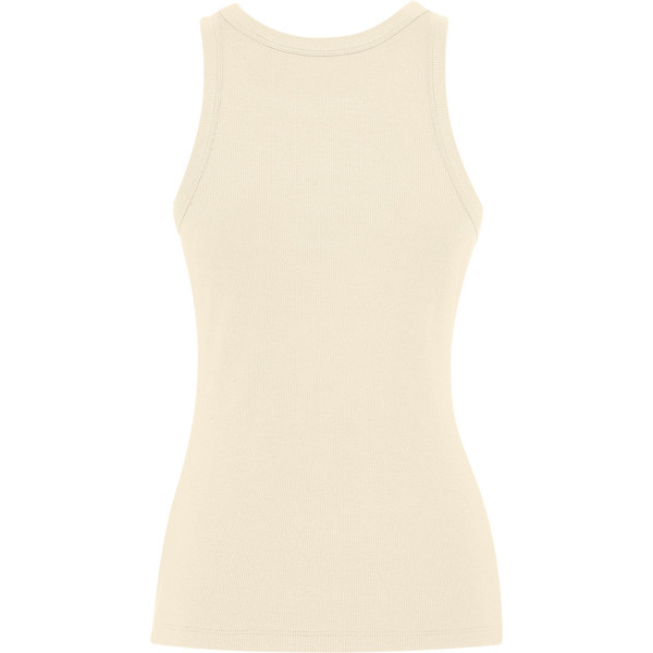 Women's ribbed knit tank top. Wide raw collar and armholes in the same fabric and reinforced with two seams. Double stitched hem.