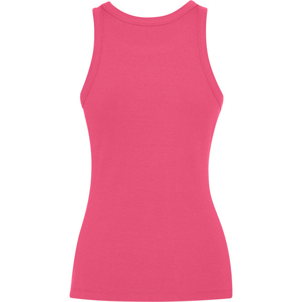 Women's ribbed knit tank top. Wide raw collar and armholes in the same fabric and reinforced with two seams. Double stitched hem.