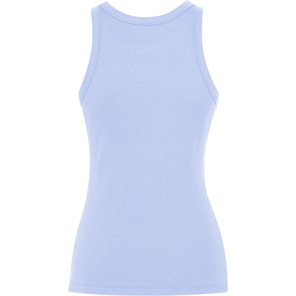 Women's ribbed knit tank top. Wide raw collar and armholes in the same fabric and reinforced with two seams. Double stitched hem.