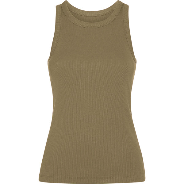 Women's ribbed knit tank top. Wide raw collar and armholes in the same fabric and reinforced with two seams. Double stitched hem.