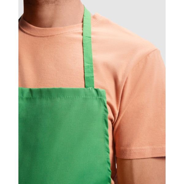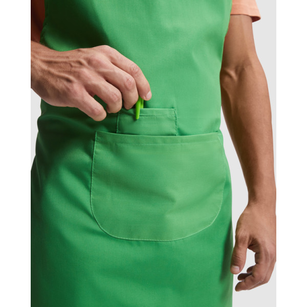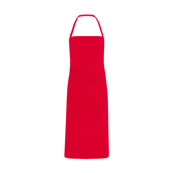 Long apron with double front pocket and matching tie-straps. · 90% polyester and 10% cotton (150 gsm). · Removable label. · One size. · Pocket measures: 25 x 16 cm.