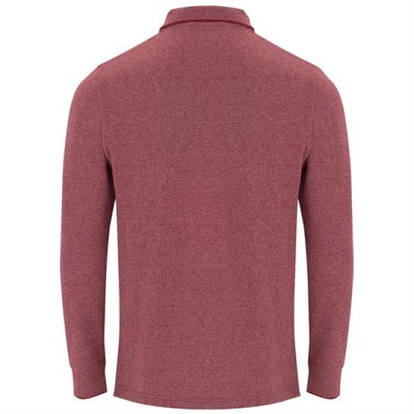 Heather long-sleeve polo shirt with matching 2-button placket. Neck and cuffs with solid colour detail. Reinforced covered seams in inside collar. Side slits with decorative contrasting tape. The pattern of the back is slightly longer than the front.