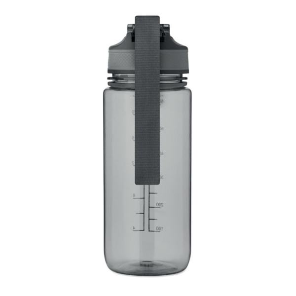 Motivational sports water bottle in RPET with integrated straw, soft silicone mouth piece, one hand opening flip top lid, safety lock. With carrying strap in RPET satin. Capacity 700 ml. Leak free.