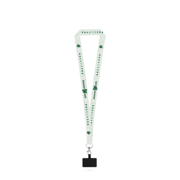 EPSOM. Vrpca za sublimaciju od recikliranog poliestera (100% rPET) s karabinerom, sigurnosnom kopčom i držačem za pametni telefon 301 - Bijela