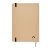 A5 notebook with hard recycled carton cover. Casebound. 160 squared recycled pages (80 sheets). Elastic closure strap, ribbon bookmark.