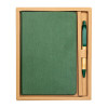 Set consists of an A5 lined notebook and a pen. The hardcover notebook has a ribbon to mark the last page used and a elastic band to keep closed when not in use. 80 sheets, cream-colored (70 g / m2 paper). Bamboo pen with blue refill. The set is packed in a brown box.