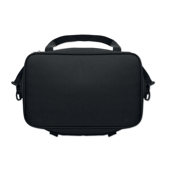Cooler bag in 600D RPET polyester with PU coating. With 1 front pocket and 1 inner mesh pocket. Isolation PEVA lining with 6mm PE foam. Includes 2 handles and 1 adjustable shoulder strap. Capacity 18L