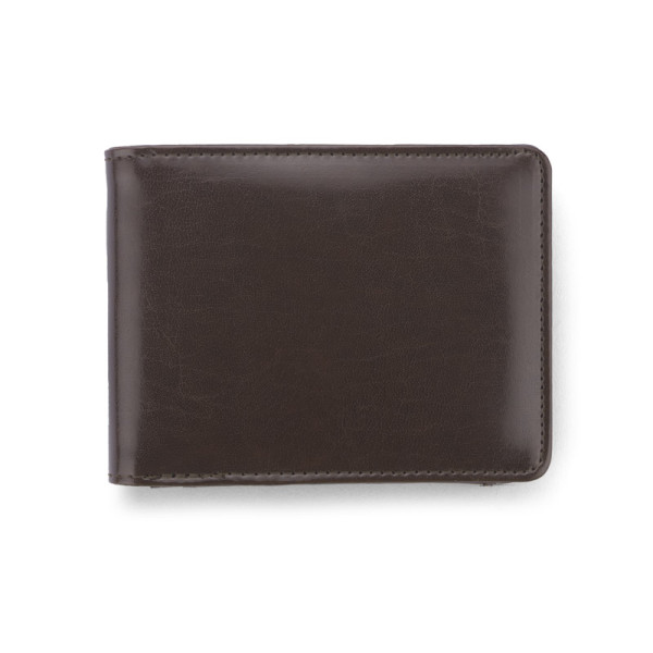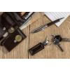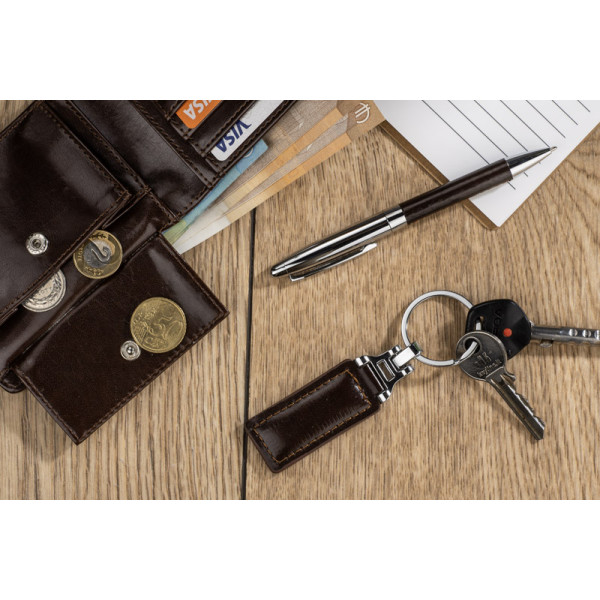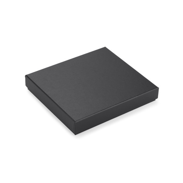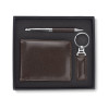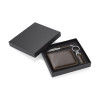 Gift set consisting of a wallet, a keychain and a metal ball pen. The wallet is made of eco-leather containing 2 bill compartments, a pouch for coins and additional pockets for e.g. credit cards or receipts. All elements are packed in a stylish black box. We might engrave a logo on each element separately as well as on the box.