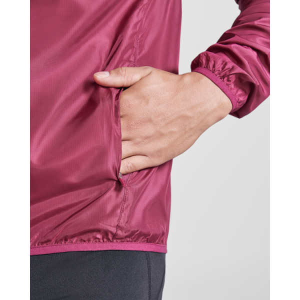 Lightweight and breathable unisex windbreaker. Inverted front zipper with reflective detail. Side pockets with inverted zips and two inner pockets. Tone-on-tone cuffs with elastic trim. Reflective detail on back.