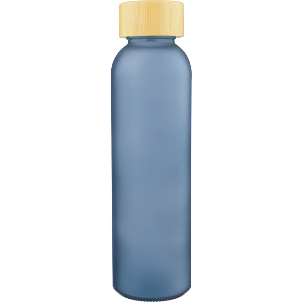 Glass drinking bottle (500 ml) with a frosted coated body and bamboo screw lid with PP inner core. Made from sodium calcium glass, suitable for cold drinks only. Individually packaged in a brown cardboard box.