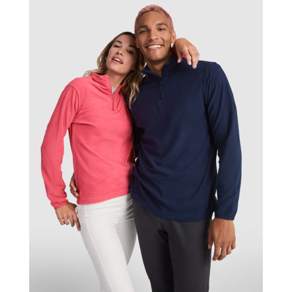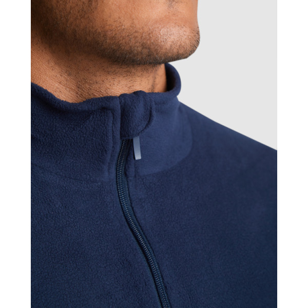 Microfleece with half zipper in neck and chin protector. Cuffs with matching elastic trim.