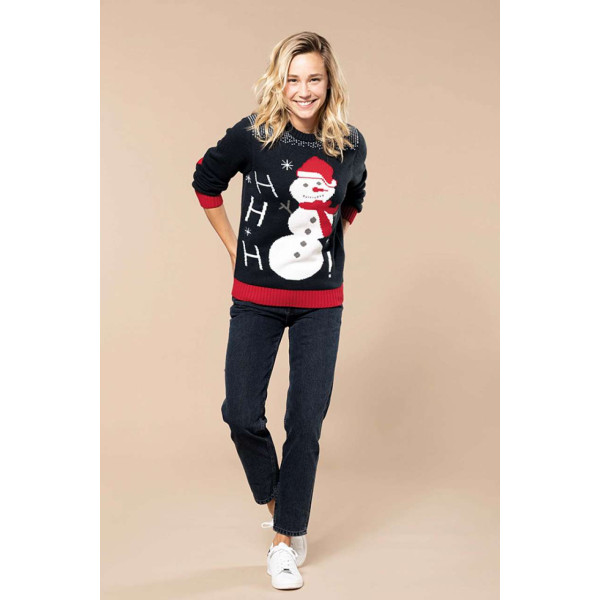 85% acrylic / 15% wool - Gauge 5;Ho Ho Ho Christmas jumper with contrasting details to be worn with the whole family;Available for adults and kids;Crew neck;Matching rib finishing at neckline and contrasting rib finishing at cuffs and hem;Contrasting elbow;
