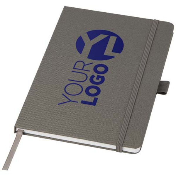 A5 notebook with cover made of RPET fabric. Features 80 sheets 70 g/m2 recycled paper with lined layout, a pen loop, and ribbon marker. Can be combined with the 107757 Honua RPET ballpoint pen.
