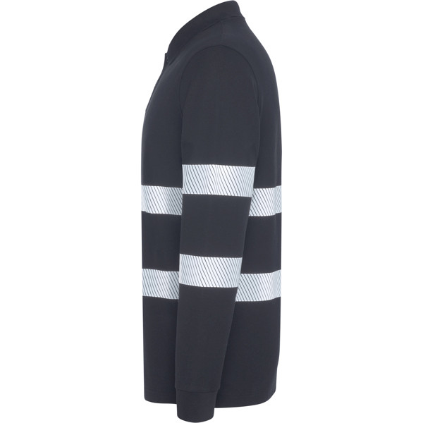 Enhanced-visibility long-sleeved piqué polo with anti-pilling treatment.· Two segmented reflective strips on the body and two on each sleeve.· Tone-on-tone 3-button placket.· 1x1 ribbed collar and cuffs.· Taped neckline.· Pocket, optional.· Outer Roly WRK label.· Wash cycles: x25