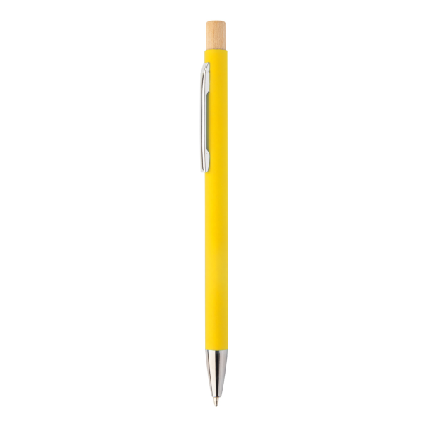 Recycled aluminium ballpoint pen with rubberized finish and bamboo button and chrome details. With special coating for mirror laser engraving. With blue refill.