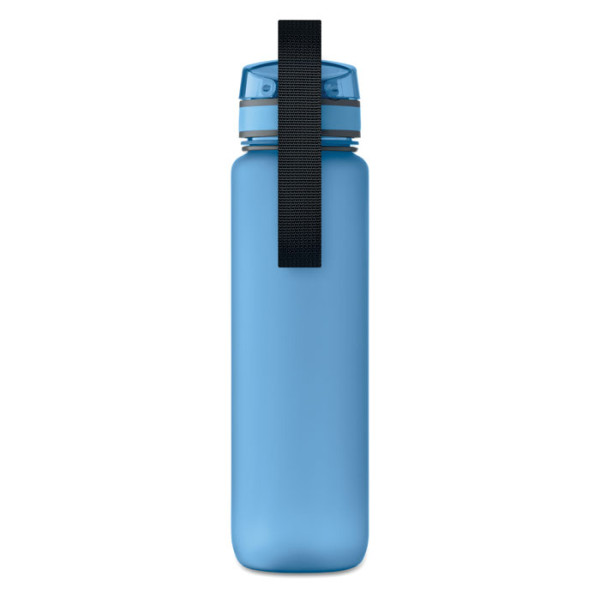 Sports water bottle in RPET, motivational time markings, one hand opening flip top lid, safety lock and carrying strap. Leak-free. Capacity: 1L.