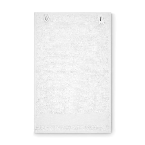 Guest towel made of 100% cotton, 380 gr/m² fabric with cotton hanger loop. Soft and absorbent design. Size 30 cm x 50 cm.