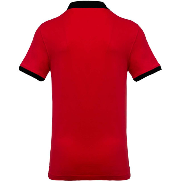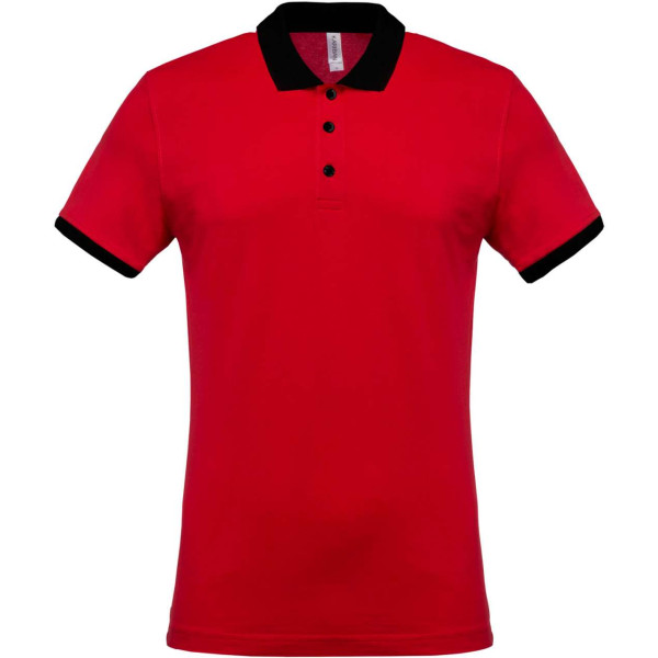 100% pre-shrunk cotton piqué;Contrasting rib at neck and cuffs;Contrasting taped neck;Contrasting inner placket with 3 buttons;Twin needle finishing at hem;